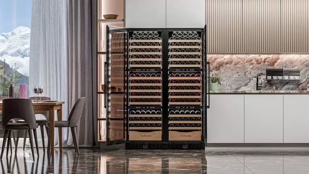 Компрессорный винный шкаф Meyvel MV154PRO-KBT3 Компрессорный винный шкаф Meyvel MV154PRO-KBT3 — идеальное место хранения и демонстрации коллекции вин в ресторанах, барах или винных комнатах. Он вмещает внушительную винотеку до 154 бутылок типа «Бордо», а если размер бутылки нестандартный, то съемные полки решат эту проблему. Три независимые температурные зоны для разных сортов напитков: верхняя поддерживает температуру от +5 до +20°C, средняя — от +5 до +12°C, нижняя — от +12 до +20°C. Подсветка белого, синего или янтарного цвета создает правильную атмосферу для эффектной демонстрации содержимого. Модель MV154PRO-KBT3 может быть как отдельностоящей, так и встроенной в нишу, а перенавешиваемая дверь предоставляет возможность разместить ее в любом удобном месте. Стоит отметить низкий уровень шума — всего 41 дБ, поэтому холодильник для вина не потревожит владельца неприятными громкими звуками. Для вашего спокойствия Meyvel MV154PRO-KBT3 оснащен системой сигнализации, которая оповестит об отклонениях температуры, функцией блокировки панели управления, предотвращающей случайные изменения настроек, и замком. Угольный фильтр очищает воздух внутри шкафа от посторонних запахов. Надежный, функциональный и стильный винный шкаф Meyvel MV154PRO-KBT3 станет достойным украшением ресторана, бара, гостиницы или кухни опытного коллекционера. Преимущества Meyvel MV154PRO-KBT3: вместимость (до 154 бутылок); три температурные зоны; два типа установки; перенавешиваемая дверь; угольный фильтр; подсветка; тихая работа (41 дБ); стильный дизайн.