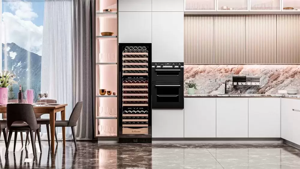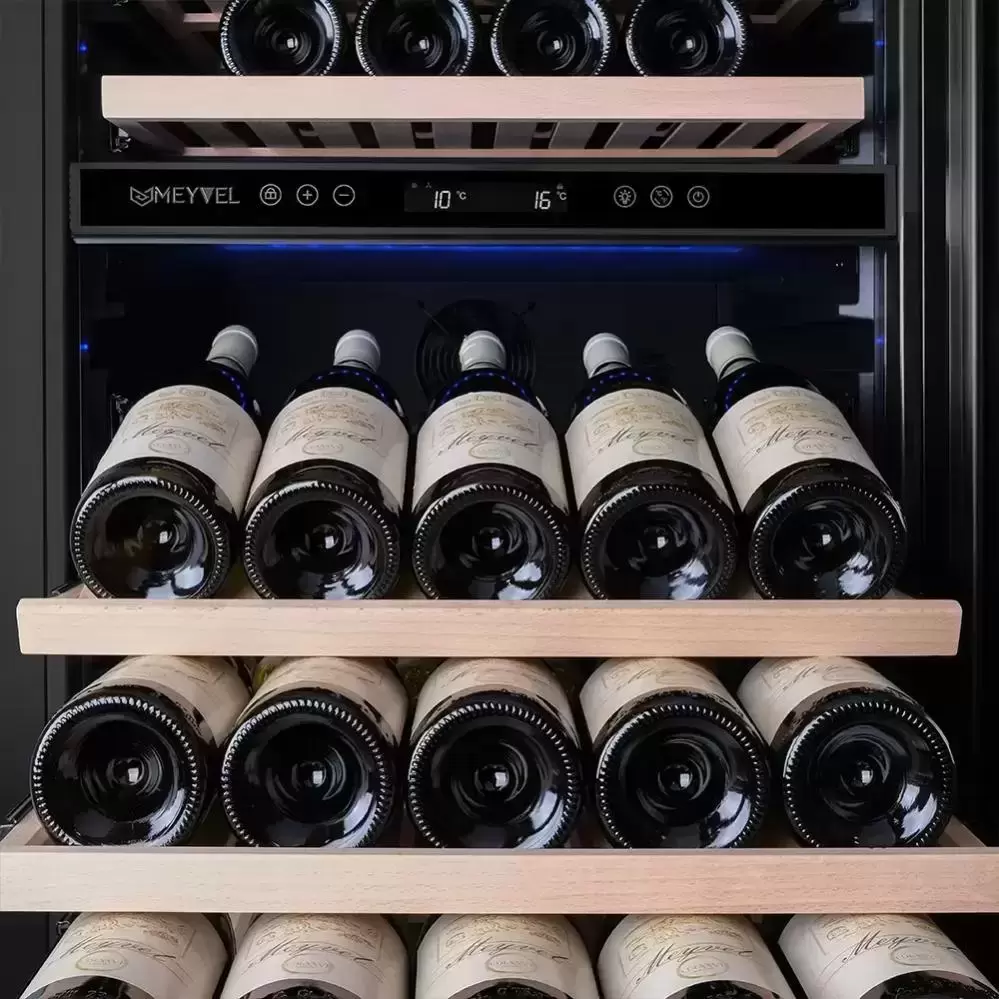 Винный холодильник Meyvel MV154PRO-KBT3 имеет несколько температурных зон, в которых одновременно можно хранить разные сорта алкоголя и выставлять разные сочетания настроек. Он встраивается в нишу, что удобно, если у вас ограничен метраж помещения. Количество бутылок, которое можно разместить с учетом полной комплектации и из расчета объема бутылки 0,75 л, — 154 шт.
