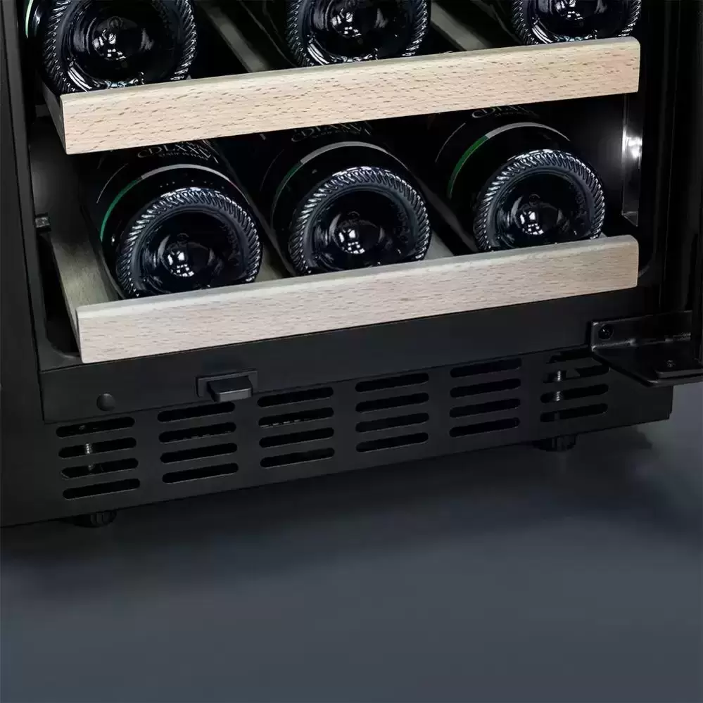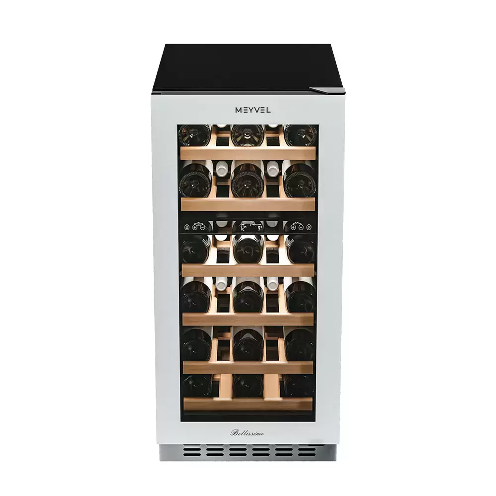 Винный холодильник Meyvel MV28NH-KWT2 имеет две температурные зоны, в которых одновременно можно хранить разные сорта алкоголя и выставлять разные сочетания настроек. Он встраивается в нишу, что удобно, если у вас ограничен метраж помещения. Благодаря компактным размерам данная модель — отличный выбор для офиса, гостиничного номера. Количество бутылок, которое можно разместить с учетом полной комплектации и из расчета объема бутылки 0,75 л, — 28 шт.